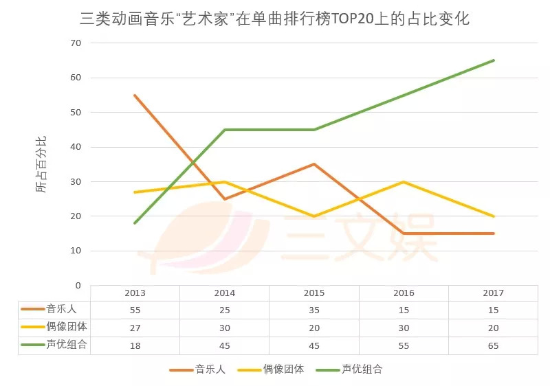 声优团体作品的榜上占有率却逐年攀升。2017年更是高达65%。声优演唱的歌曲作品人气和影响力不断扩大,甚至超过偶像团体。
