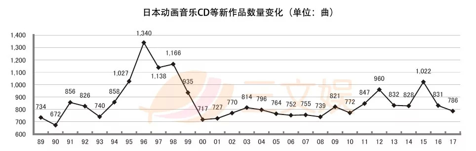 但没有亮眼作品的出现,却暗示了日本动画音乐创新上的一些疲软。从动画音乐新作数量变化来看,2017年新作数为786曲,是继2010年以后时隔6年首次降到800以内。