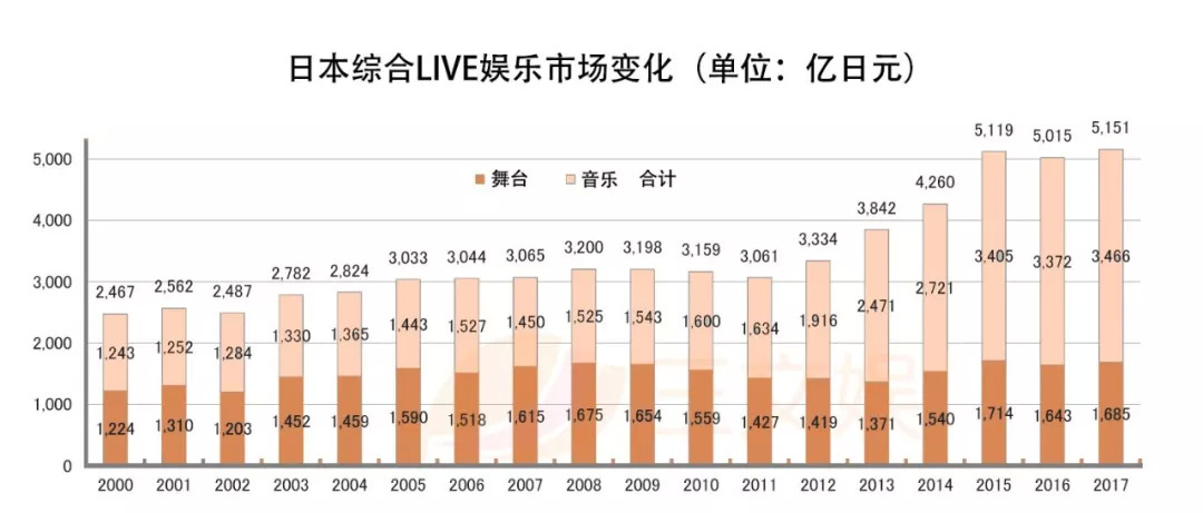 早在几年前就有媒体曾就提出,由于日本近年大众消费方式由物质消费转型体验消费,音乐光盘市场萎缩,而音乐舞台市场快速增长。2000年~2015年间,日本音乐+舞台的市场规模从2467亿日元,增长到5030亿日元,加上政策、震灾、经济泡沫、奥林匹克召开等多重因素,导致场馆严重不足。这也将是未来2.5次元音乐剧市场需要解决的问题之一。