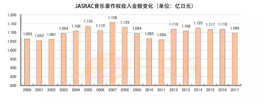 根据JASRAC的观测,2017年日本音乐著作权收入为1096亿日元,为前一年的98%。