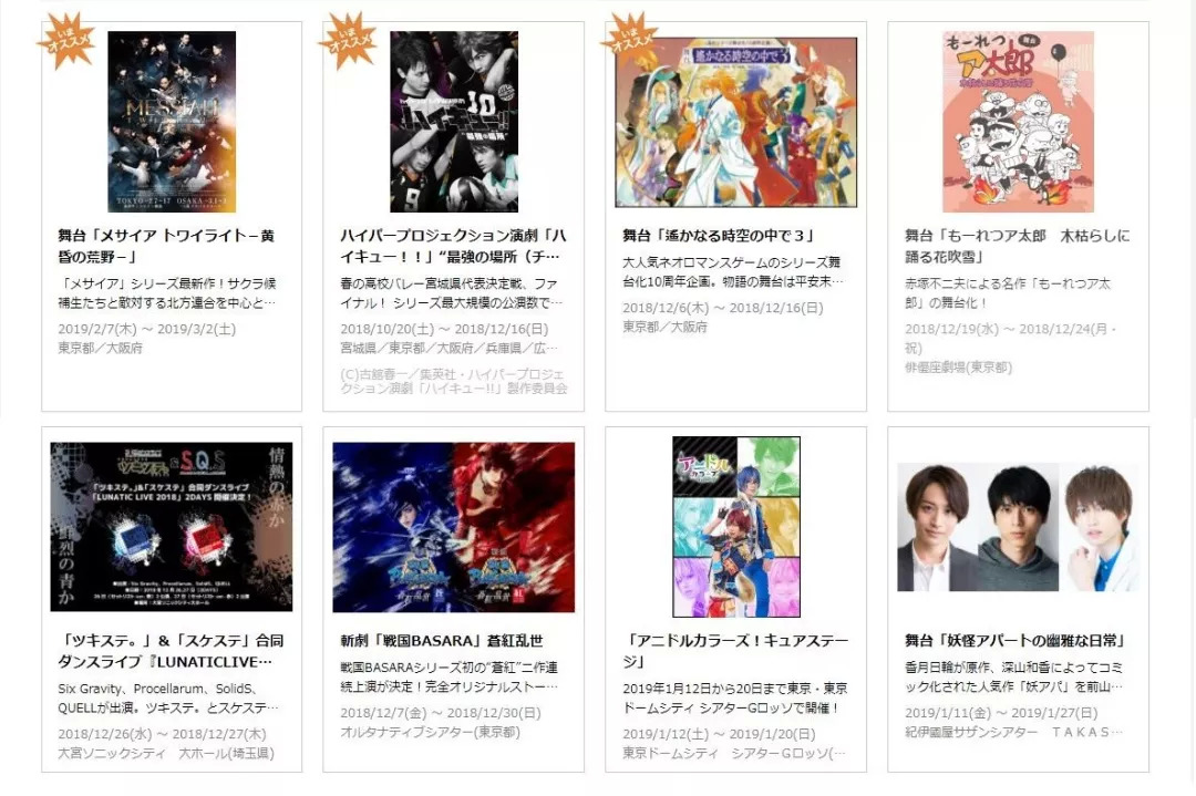 不过能够达到全国规模的LIVE直播仅限于人气作品。如以游戏为原作的《LOVE LIVE! SUNSHINE!!》、《偶像大师》、《歌之王子殿下》、《刀剑乱舞》等,还有漫画为原作的《阿松》、《七大罪》,都与前文所提到的动画现场相似,多数是将动画作为跨媒体联动的一环。