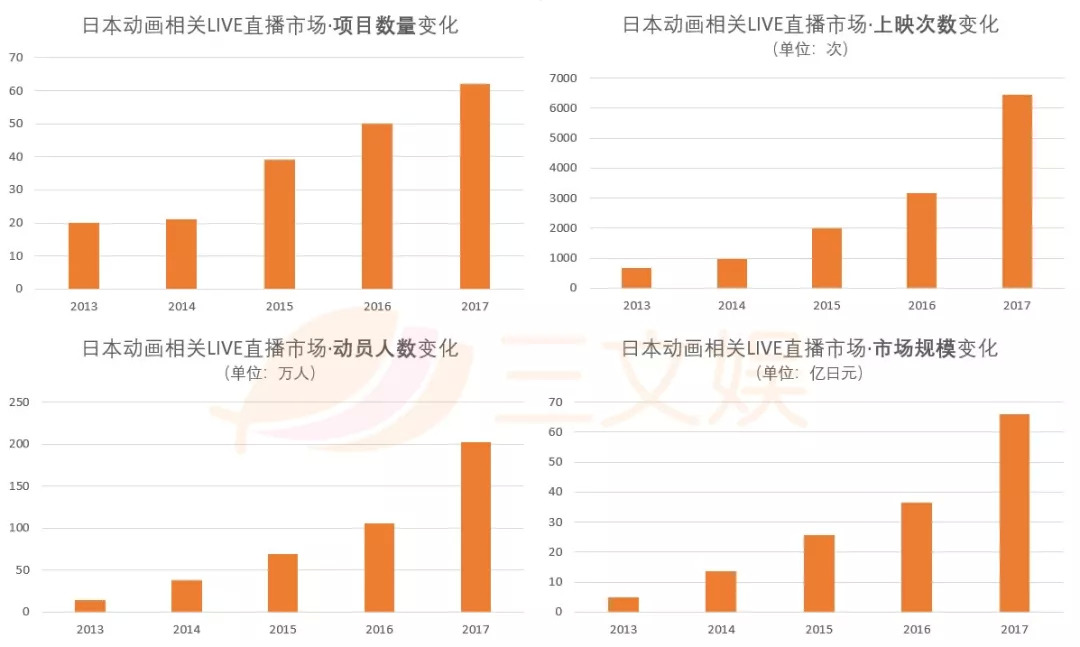 随着“LIVE活动”的热气大增,“LIVE直播公映”与前年相比急速增长180%,市场规模达到65.8亿日元。LIVE直播公映是指在举行LIVE活动的同时,在其他地方会场通过上映同步直播,观众需要买票观看。