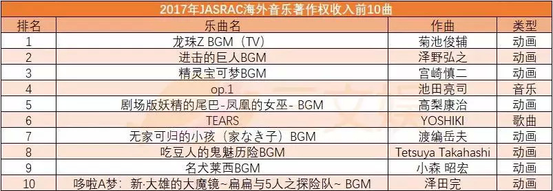具体到动画音乐版权收入。日本国内市场上,以前每年的国内音乐著作权收入TOP10,都会有动画乐曲入围,但2017年并未出现。
