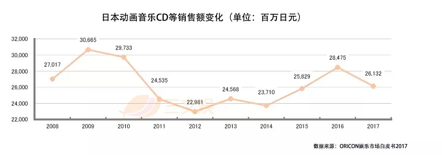 2017年,以CD等销量推算的日本动画音乐市场为261亿日元,比前一年下降8.3%。