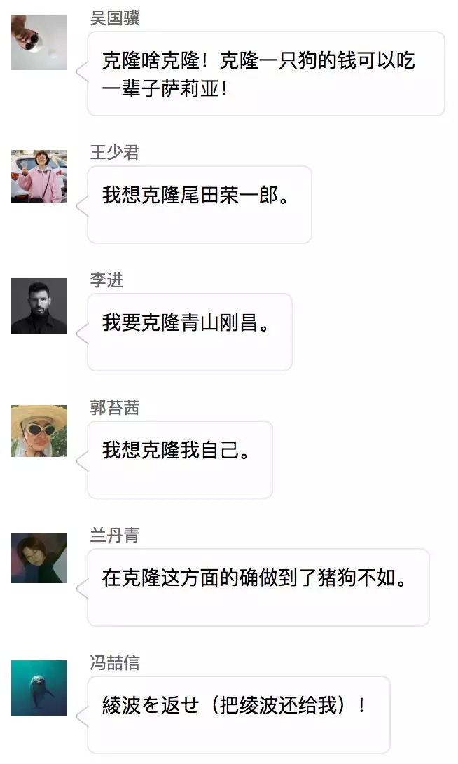他举了个例子,当初基地第一只克隆狗出来时,因为大家都没有见过本体狗的照片,就问狗主人要了一张,所有人看了半天都觉得不像。结果在克隆狗出生后第二天主人来了,一看到就叫“这是我的狗”,说尾巴尖是白色的,和去世的狗狗一样,花纹也像,就连吃奶的动作都和去世的狗狗一样,“就是那样子的,你一看就是它。”