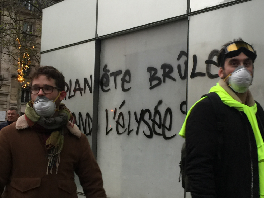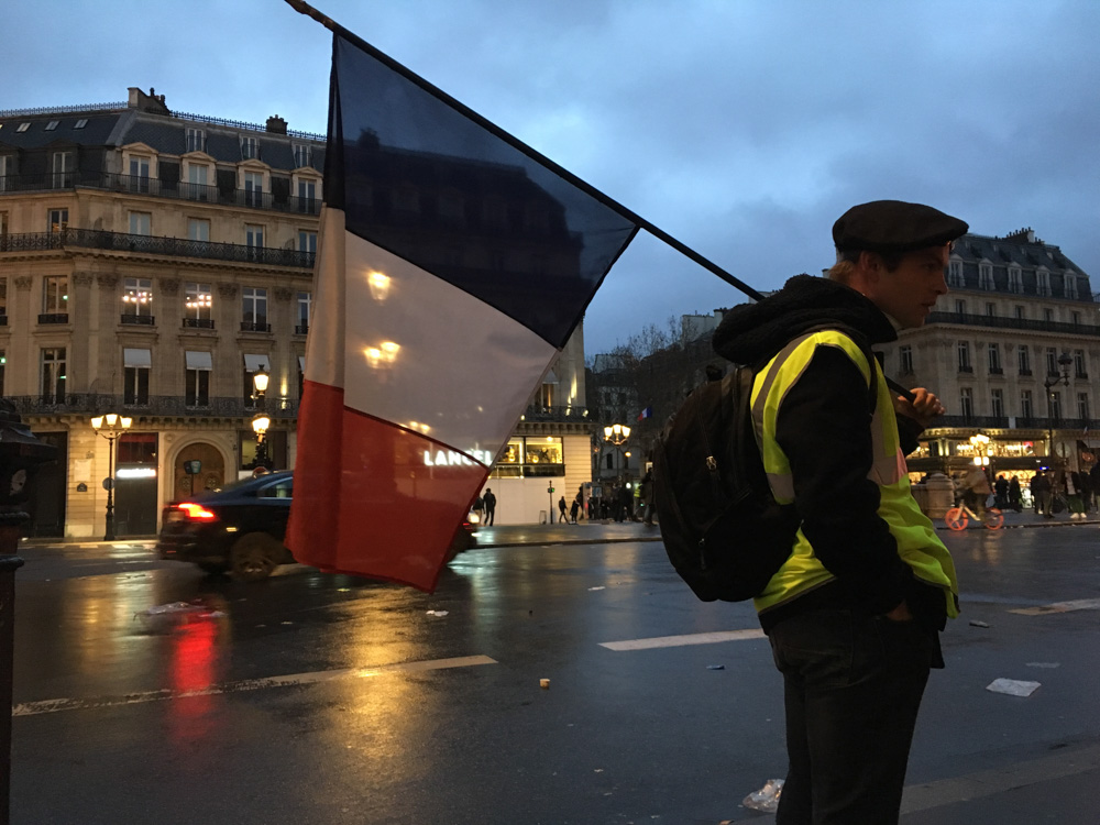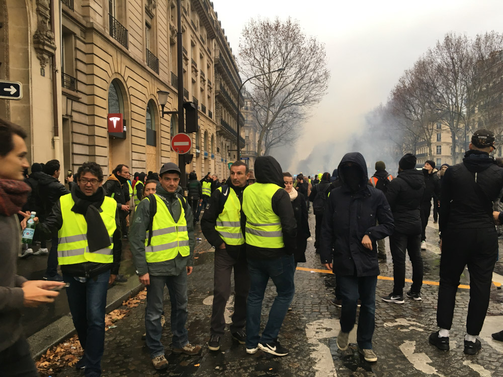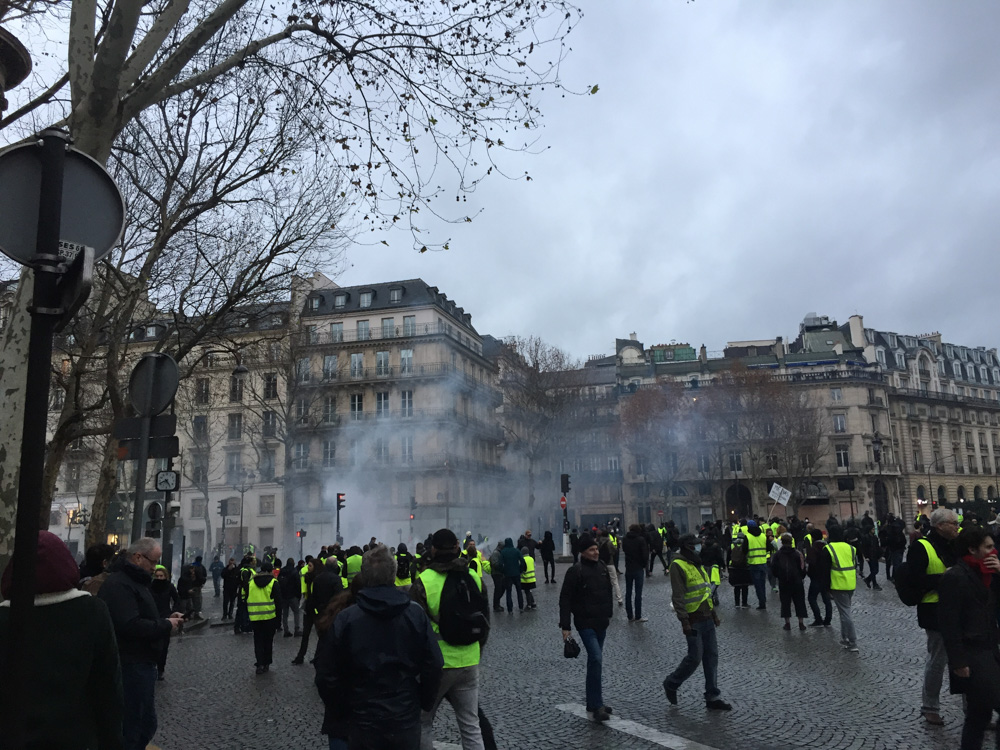 她早上出门去四处看了看。歌剧院附近,很多店铺都关了门,行人也少了。在靠近酒店的奥斯曼大道,她遇到了游行的黄马甲。然后,还没有明白怎么回事,她发现自己站在了警察和游行者的中间地带。看到远处烟雾升起,她有些害怕,蹲在一家超市前面。分不清是警察还是黄马甲,扔了一些东西在地上,有破碎的声音,还有枪管发射的声音。一颗催泪弹落在了她的身边,正在冒烟。她以为会爆炸,赶紧起身,跑进了超市。人群也乱了,四散奔逃。这种局面持续了大约十分钟。