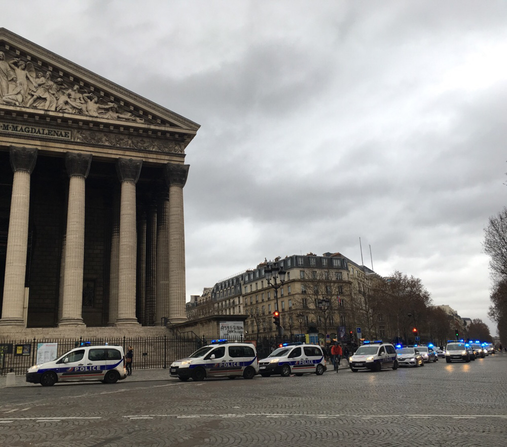 恢宏的玛德莱娜教堂在视野中出现。这座新古典主义建筑,伫立在协和广场的北侧,爱丽舍宫的东边。一列警车鸣着警笛从身后驶来,停在教堂门前,不知在等待什么,过了几分钟,全转向协和广场方向,消失在一条小路里。远远可以看到,协和广场已经封闭,黑色的铁网横在路中间。大约有一千个人,集中在教堂西边的马勒塞尔布大道,那里直接通向市政厅,拐个弯也可以去爱丽舍宫。大道前方约两百米,是严正以待的警察。我可以确认,这就是黄马甲游行的中心区域了。