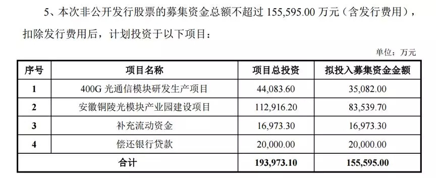 其中,超过半数以上的募集资金拟投入“安徽铜陵光模块产业园建设项目”。