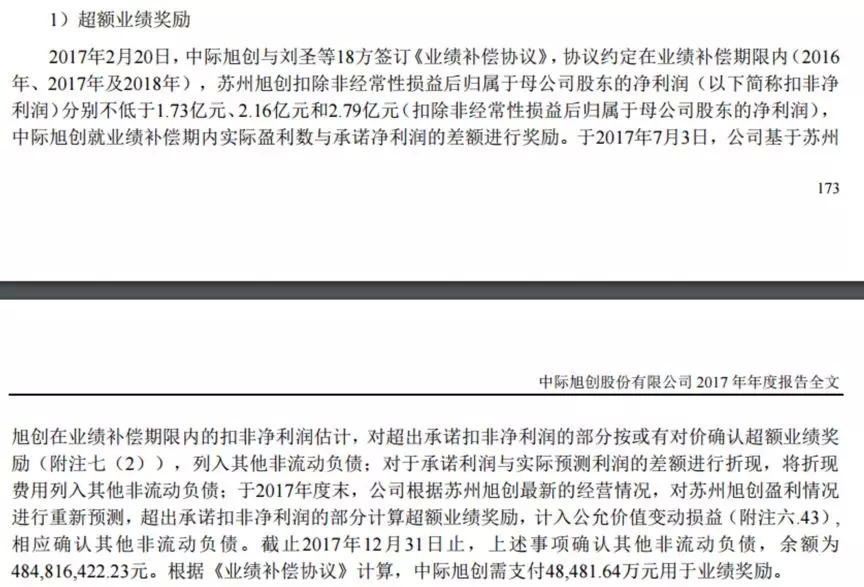 2017年年报显示,根据《业绩补偿协议》计算,中际旭创需支付48,481.64万元用于业绩奖励。截止2017年12月31日止,上述事项确认其他非流动负债,余额约4.85亿元。