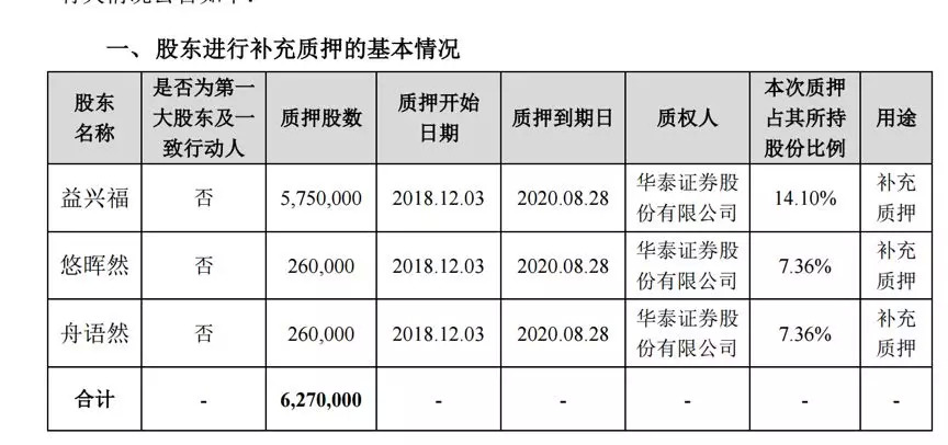 截止2018年12月7日,益兴福、悠晖然、舟语然及其一致行动人持有公司18.09%股份,累计处于质押状态的股份合计约4957.3万股,占益兴福、悠晖然、舟语然及其一致行动人持有股份的57.64%,占公司总股本的10.43%。(GCH/YYL)