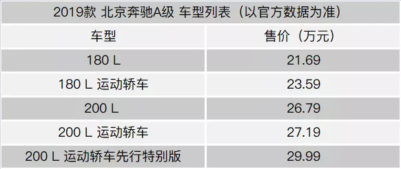 至于顶配车型A 200 L先行特别版,它在配置方面相比上面两款车型的确更加丰富,配备了专属的19英寸轮圈,以及感应后备厢、无钥匙启动、无钥匙进入、HUD抬头数字显示、手机无线充电、64氛围灯等丰富的舒适性配置,但售价也直接达到了29.99万元,就性价比而言并不十分推荐。