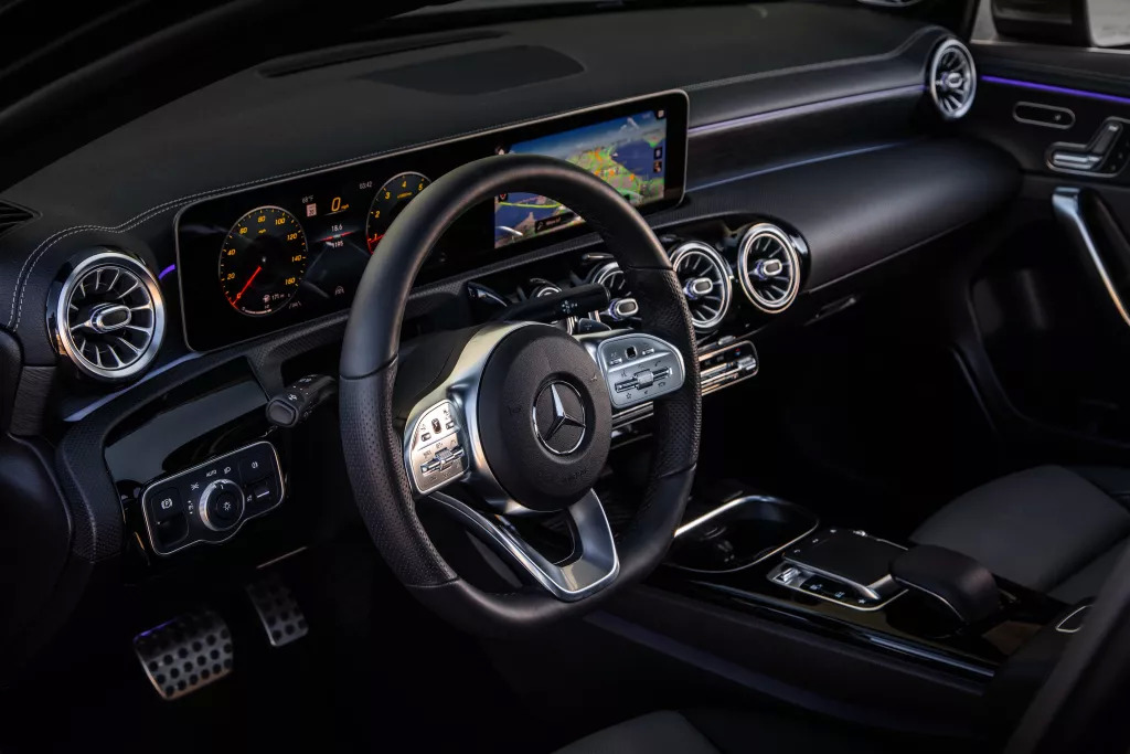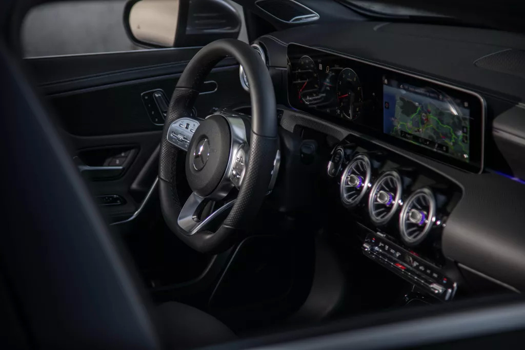来到车内,那些对这台三厢版奔驰A级外形颇有微词的朋友可以闭嘴了。它的内饰采用了奔驰最新一代的设计语言,虽然这套内饰不是首次出现,但如今放在这台入门的紧凑级车型中依然足够惊艳,特别是中控台上两块硕大的屏幕极富科技感,简直是将汽车的内饰设计直接提升到了次世代。至于用料方面则表现比较一般,采用了大面积的搪塑材料加上一些镀铬装饰,属于该级别的主流水准,