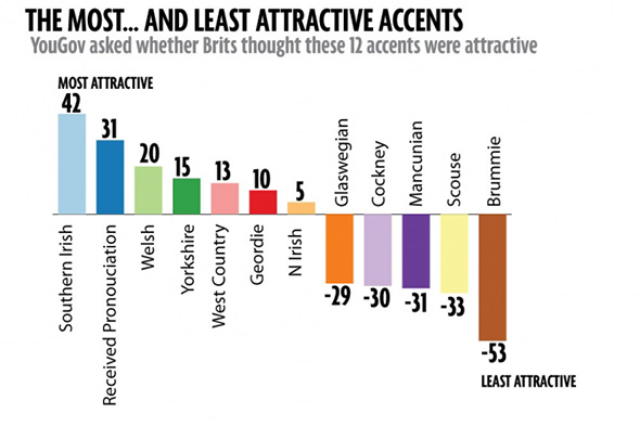 口音与社会地位关系密切。以Brummie为例,它之所以常常被认为“难听”、“不受欢迎”,和历史上英国人对中部地区的刻板印象相关。认为Brummie“不具吸引力”的大多是英国本地人,他们对伯明翰地区的印象停留在“工人阶级汇聚的工业城市”。相反,外国人却常常认为伯明翰口音“轻快且悠扬”。