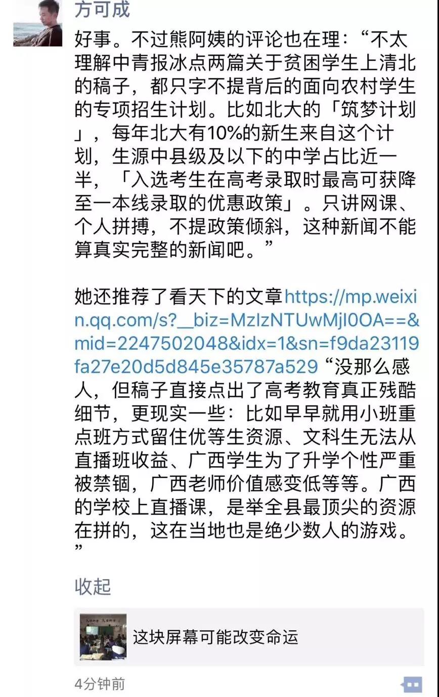 中国教育上这些不均衡发展问题的解决,似乎在这篇文章中找到了答案。《这块屏幕可能改变命运》不仅描述了一个贫困县中学通过接入成都七中东方闻道网校直播而发生惊天逆转的故事,还给出了大数据“2016年来,7.2万名学生通过直播课程有88人考上清北,大多数考上了本科”。