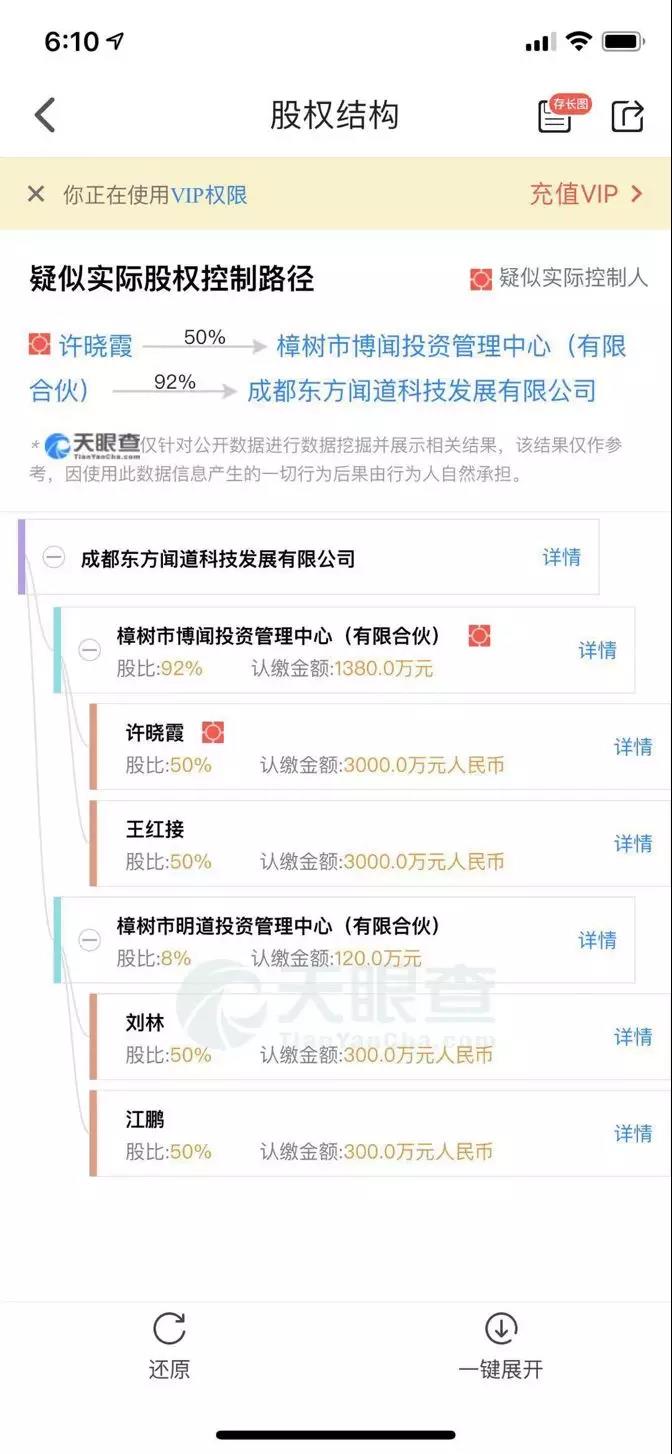 这显然是问到了无法解答的核心,所以这笔交易最后的结果就是奥威亚的收购顺利完成,但是东方闻道51%的股权收购流产了。鹿鸣财经通过天眼查查了一下东方闻道的股权结构,樟树市博闻投资管理中心(有限合伙)(下称博闻投资)持有92%,章树市明道投资管理中心(有限合伙)(下称明道投资)持有8%。王红接和许晓霞夫妇每人持有博闻投资50%的股份,刘林和江鹏也是各自持有50%的明道投资股份。