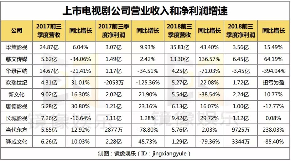 2018年,镜像娱乐(ID:jingxiangyule)统计的9家上市电视剧公司的营收和净利润增速明显放缓。从2018年第三季度财报来看,除了华策影视和慈文传媒前三季度营业收入增速与净利润增速都同比增长之外,华录百纳、新文化、唐德影视、骅威文化四家公司的营业收入增速与净利润增速都在同比下滑,其中华录百纳和骅威文化今年前三季度营业收入和净利润增速均为负数。