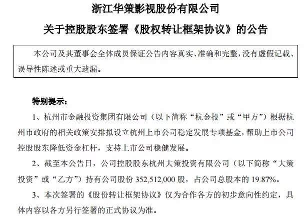 寒冬之下,电视剧行业的龙头公司华策影视也很缺钱,2018年前三季度,华策的现金流为-5.71亿,高压之下,杭州市政府也向华策伸出了援手。据华策日前公告显示,其控股股东大策投资已与杭金投签署了《股份转让框架协议》,华策将向杭金投指定的主体通过大宗交易的方式转让大策投资持有的公司不超过3549万股股票,转让价格以签署正式股份转让协议前20个交易日均价为基础,交易对价总额不超过3亿元。