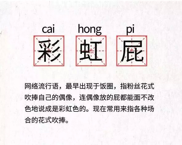 放彩虹屁原意为粉丝花式吹捧自己的偶像,是追星必备技能,现泛指各种场合的花式吹捧,后又由男孩吹捧女友把“彩虹屁”发扬光大。