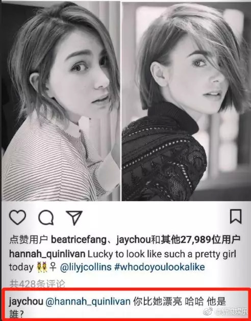 体现在日常生活中的方方面面,奶茶哥周杰伦的老婆发自拍撞脸莉莉·柯林斯,周杰伦赶紧在底下评论:你比她漂亮。