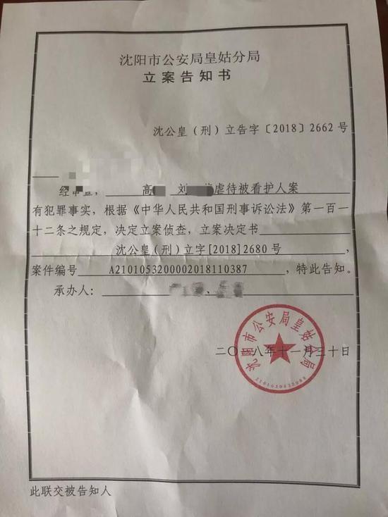 这份立案告知书图片显示,高某、刘某某因虐待被看护人案有犯罪事实,被依法决定立案侦查。