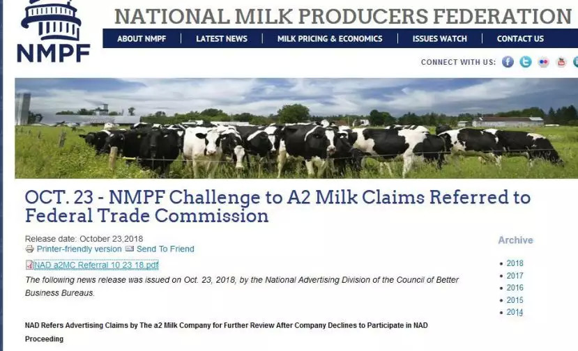 据了解,就在今年10月,美国乳品制造商联盟发布公告称,质疑A2牛奶广告中存在虚假承诺与不恰当表述,并已提交美国广告部。