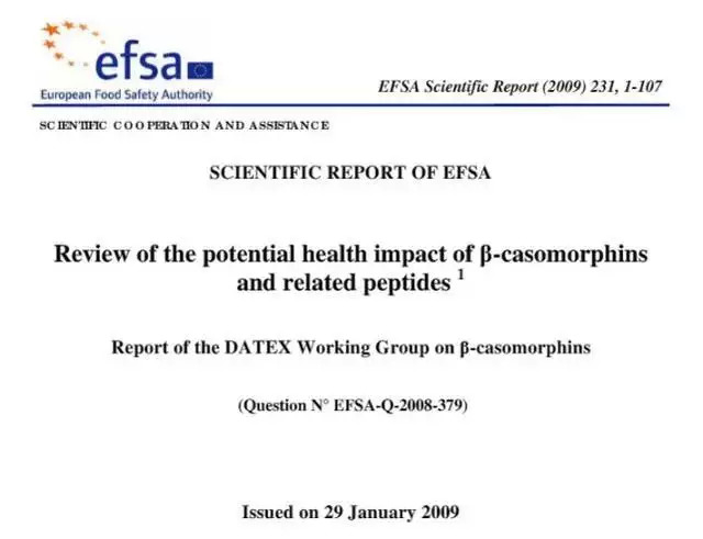 2009年,欧盟食品安全局发表的一篇报告(《Review of the potential health impact of β-casomorphins and related peptides》)指出,基于现有科学文献的回顾,不能建立口服摄入BCM-7或相关肽与任何非传染性疾病的因果关系,因此不推荐对BCM-7等进行正式的风险评估。而一些声称BCM-7或A1蛋白可能导致糖尿病、心脑血管疾病、中枢神经系统影响的研究结果,在报告中均被欧盟食品安全局判定为“没有明确证据”或“缺乏数据支持”。