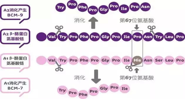 而A1和A2型的差别在于第67个氨基酸上,A1在那个位置是一个组氨酸,而A2是一个脯氨酸。在蛋白酶消化酪蛋白的时候, A1那个位置的组氨酸可能被切开形成一个7个氨基酸组成的多肽,被称为beta-casomorphin-7,简称BCM-7。而A2那个位置的脯氨酸不容易被切,因而不能形成BCM-7。