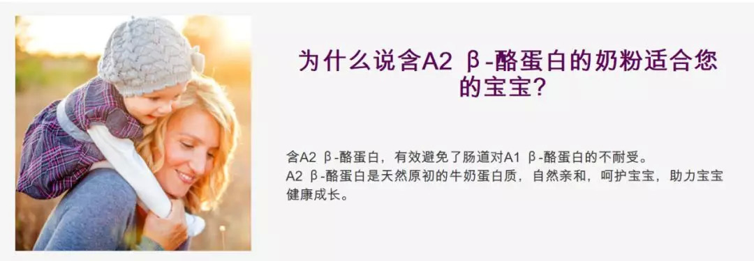 事实上,A2β-酪蛋白概念的兴起,源于A2有限公司(下称:A2公司)提出,牛奶中含有常见的两种β-酪蛋白:A1β-酪蛋白和A2β-酪蛋白。而这两种β-酪蛋白的蛋白质结构存在着差异,A1在消化过程中可生成β-酪啡肽-7(BCM-7),而A2则不会生成BCM-7。也正是这种结构差异, 使得A2β-酪蛋白比A1更接近天然母乳中的蛋白质。另外两者在人体消化过程中也不一样,含有A2β-酪蛋白的奶粉可以有效避免肠道对A1β-酪蛋白不耐受反应。