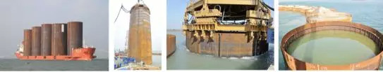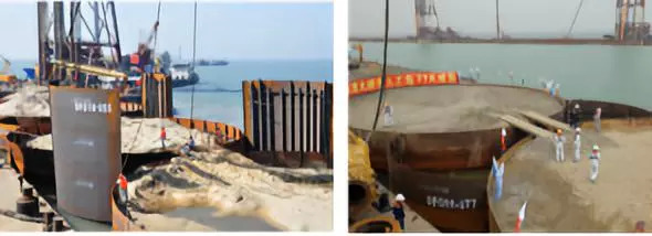 人工岛的建设其实没有我们想象得那么复杂,在挖泥船疏浚好一块区域以后,我们把一个个圆筒型的钢桩插到水下,把它进行连接,里边再灌注泥沙。