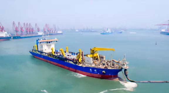 这艘船一个小时可以疏浚两万方的泥土,航行到指定的区域以后,可以通过吹填管线的连接方式,把它送到我们需要填海造陆或者造岛的区域。