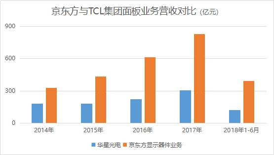 从近几年的财务数据上来看,二者营收不在同一量级,京东方是华星光电的近三倍。2014年至2017年,京东方显示器件业务营收分别为327亿元、435亿元、612亿元和826亿元。期间,华星光电分别为180亿元、180亿元、223亿元和305亿元。
