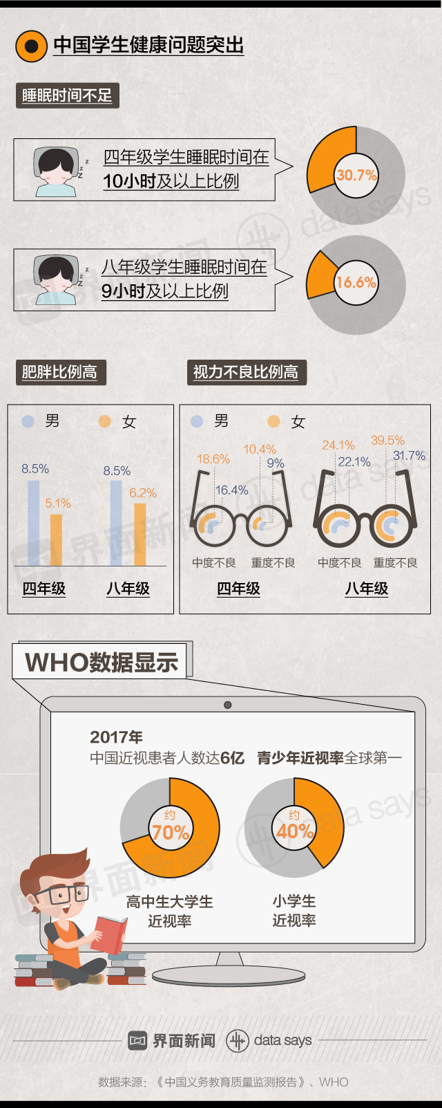 2018年7月,教育部发布的国内首份《中国义务教育质量监测报告》指出,绝大多数中小学生都长期处于睡眠不足状态,且肥胖比例和视力不良比例较高。