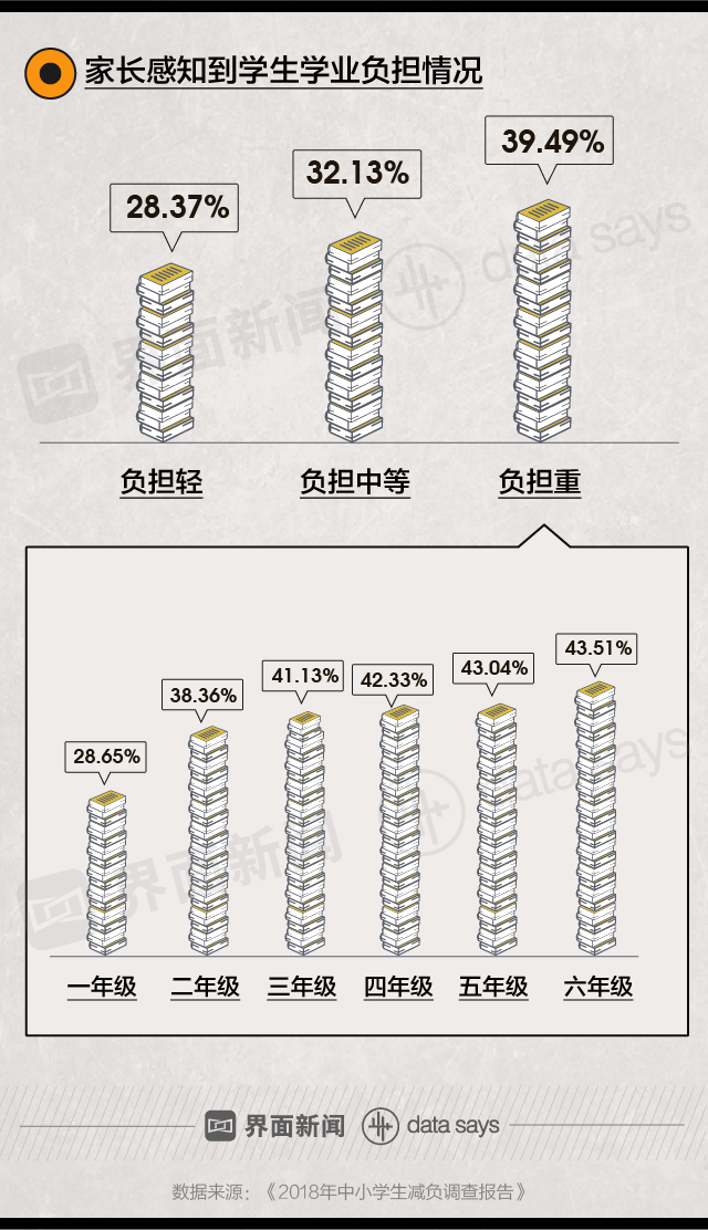 中国教育三十人论坛近日发布的《2018年中小学生减负调查报告》显示,有近四成家长认为孩子的学业负担重。单单小学阶段,就有近一半的六年级学生家长认为孩子学业负担重。