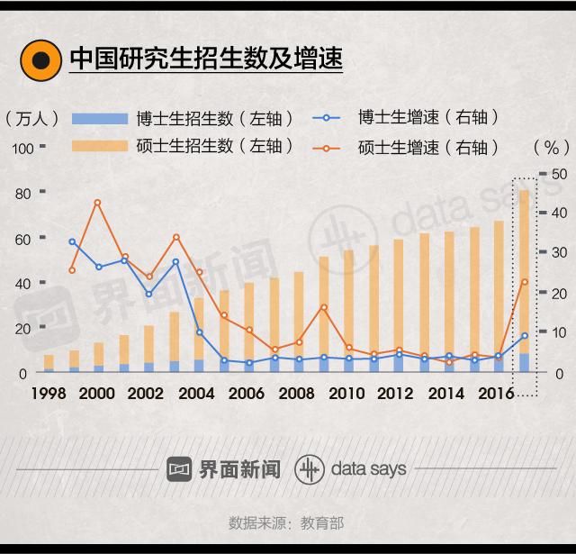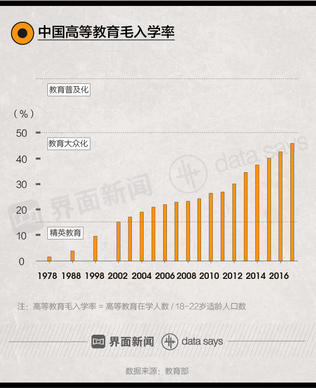 1999年,中国决定扩大普通高校本专科院校招生人数(即“大学扩招”),此后,中国高等教育毛入学率快速增长,本科学历没那么“值钱”了。