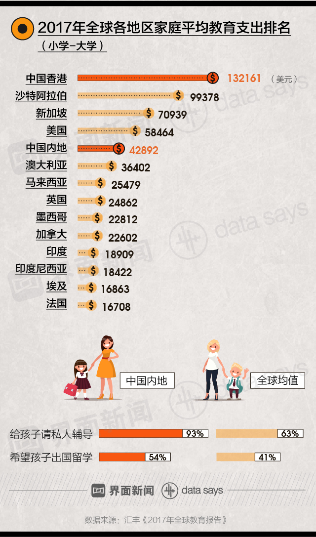 中国家长在孩子教育上也特别舍得花钱。汇丰《2017年全球教育报告》显示,中国香港、中国内地家庭的教育支出分别约合人民币91万和30万,领跑全球。93%的中国家长曾经给孩子请过私人辅导,远超全球均值(63%),排名全球第一。