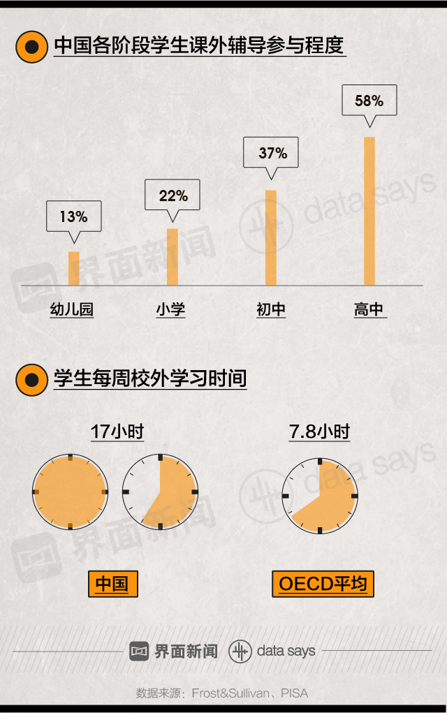 PISA数据显示,中国学生平均每周课外学习时间13.8小时,名列全球第一,加上校外辅导和私人家教,每周校外学习时间达17小时左右,远高于OECD国家的平均值7.8小时。