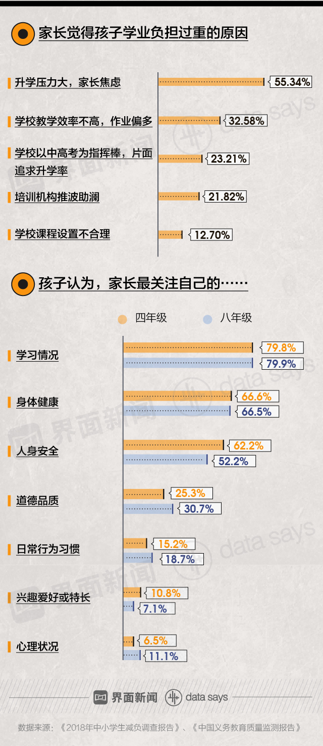 说到学习问题,中国家长一般都比孩子更激动。《2018年中小学生减负调查报告》显示,有超过一半的家长表示,孩子学业负担重是因为“升学压力大,家长焦虑”。