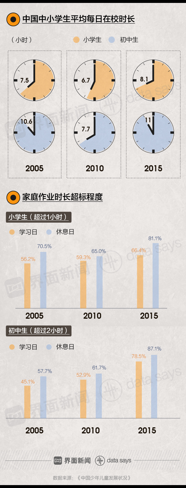 中国青少年研究中心“中国少年儿童发展状况”课题调研显示,2015年,中国中小学生的每日平均在校时间比一般白领的工作时间都要长,家庭作业时长超标程度最高超过80%。