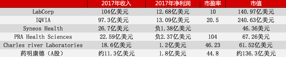 对比全球前十榜单的几家同行可以发现,目前市值和药明康德比较接近的是位于榜单第一名的LabCorp。不过,后者2017年的营收和净利润差不多是药明康德的10倍,同时其市盈率只有10倍。同时,2017年净利润和药明康德最接近的Charles River Laboratories,2017年营收比药明康德多了超7亿美元,市值只是药明康德的二分之一。