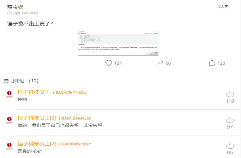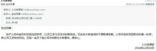 此事就这么悬而未决,锤子科技飘摇度过了一周后,继而爆出欠发员工薪资,再次证实缺钱事实。12月10日,脉脉职言区传出一张疑似锤子科技内部的邮件截图。这封邮件发于12月10日下午14点,内容显示:“由于公司未能及时收回应收款项,11月工资今日无法如期发放。对此给大家造成的不便敬请谅解。公司会在收到回款后的第一时间,将11月工资发放到位。五险一金及个税公司会如期为大家缴纳,请放心。”