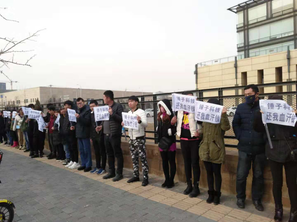 12月5日,北京望京北路上行人寥寥、雾霾沉沉,中国数码港大楼外面站着一排愤怒的人群。这些在寒风中颤抖着讨债的供应商们,有序地列成一排,拉起了一条“锤子科技还我血汗钱”红色横幅。有网友路过,正好将这幅场景拍下并传在了网上。
