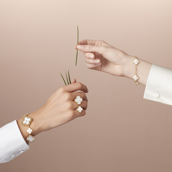 除了希望通过 “四叶草”获得幸运,创新意识和工艺品质也是支撑着世家稳步向前的基础。50年来,光是“Alhambra四叶幸运系列”的材质就有数十种。青金石、孔雀石、缟玛瑙、珊瑚、虎眼石、绿松石、白色灰色珍珠母贝、红玉髓、镶钻黄K金、蓝玛瑙、透明水晶、玉髓、塞夫勒瓷和蛇纹木等材质相继面世,让人们看到了梵克雅宝对“幸运”的不同解读和表达。