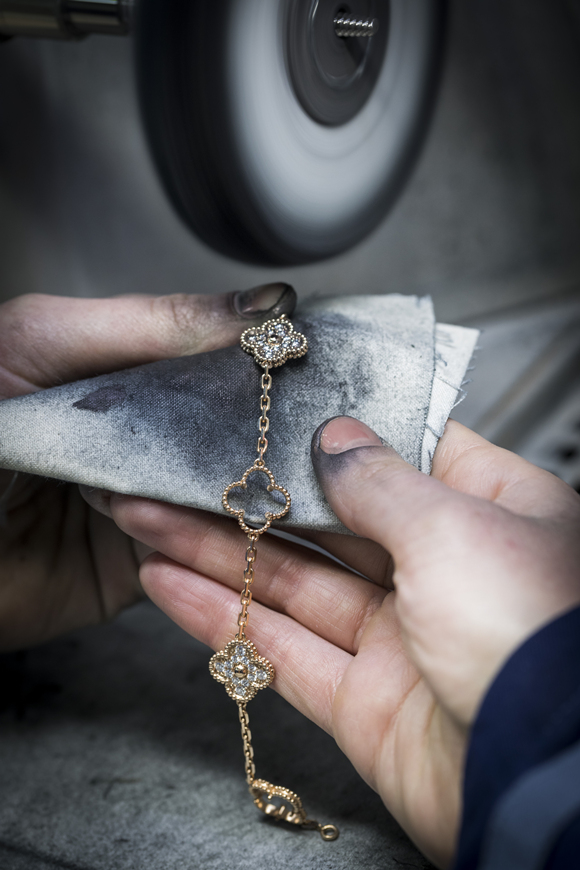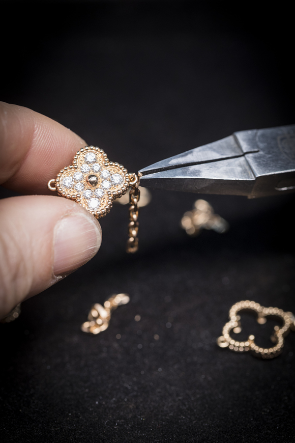 首先梵克雅宝会按照极其严苛的品质标准挑选宝石。这些宝石的切割过程也要一丝不苟,围绕在四叶幸运图案周围的黄K金则会被铸成圆珠形状,再由工匠进行人工修饰后,将其固定于金质镶座上,并细心固定镶爪位置。这一步也是很困难的,因为大部分宝石硬度不高,如果力度掌控不好就很容易破碎或产生瑕疵。在每一道工序完成后,工匠们都需要对珠宝进行抛光,保证它们圆润平整、呈现宝石光泽。待这些步骤完美无误地完成后,方为一枚合格的四叶幸运图案。