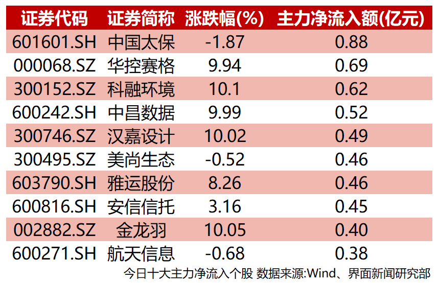 个股表现上看,除去未开板新股,沪深两市无一个股主力净流入额超过1亿元。中国太保(601601.SH)吸引0.88亿元主力资金流入位居榜首;科技股冲高回落,版块内华控赛格(000002.SZ)、科融环境(300152.SZ)分别吸引0.69亿元、0.62亿元位列二三,双双封涨停;大基建板块受到资金追捧,汉嘉设计(300746.SZ)叠加次新股因素吸收0.49亿元主力资金封涨停。