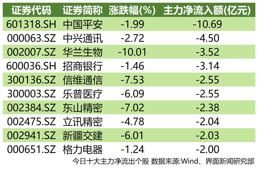 沪深两市共计35只个股主力资金净流出额超1亿元。榜上常客中国平安(601318.SH)本周第三次登顶,今日遭到10.69亿元主力净流出,甩开第二名约6亿元差额;中兴通讯(000063.SZ)、华兰生物(002007.SZ)分别遭遇4.50亿元、3.52亿元主力资金流出分列其后。5G等科技股全线走低,东山精密(002384.SZ)、立讯精密(002475.SZ)分别遭遇2.38亿元、2.04亿元主力净流出。