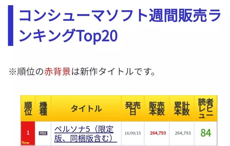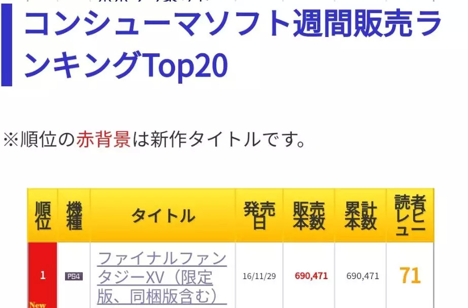 在日本游戏销量普遍低迷的2016年中,这个数字已经是一个颇为优秀的成绩。作为对比,地位足以和《最终幻想》系列平起平坐的《女神异闻录》系列第五作,首周销量仅为《最终幻想15》的一半不到。