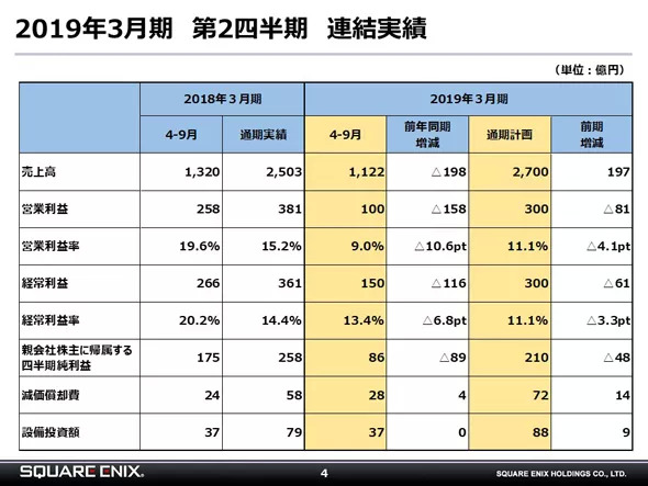 2018年11月7日,SE 2019财年第二季度(相当于国内2018年第三季度)财报公布。上半年SE的营业额为1122亿日元,同比减少15%,营业利润100亿日元,同比减少61%。其中工作室Luminous Productions由于业务调整,在没有任何盈利项目的情况下为SE带来了37亿日元的巨额亏损。