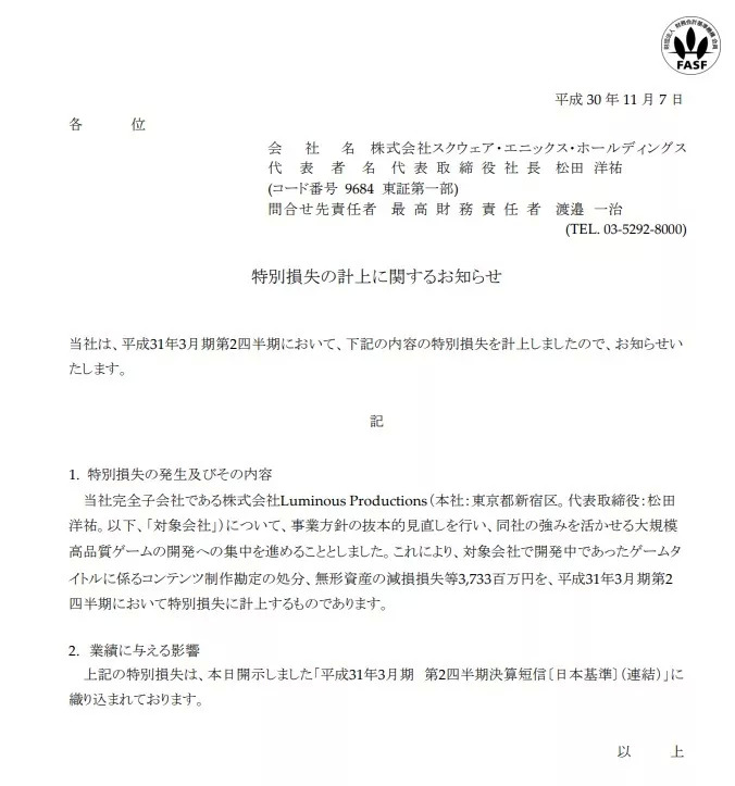 SE 2018-2019年财年Q2报告和特别损失报告书,有关Luminous Productions的亏损另起公文
