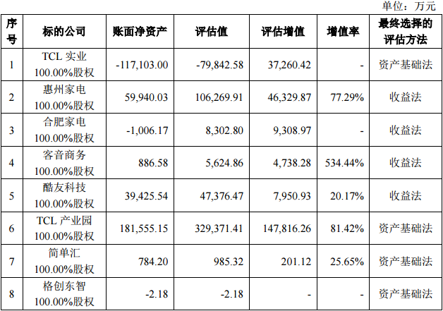 让人大跌眼镜的是,资产包中最重要的一块资产TCL实业评估值为-7.98亿元,评估增值3.73亿元,评估方式为资产评估法。