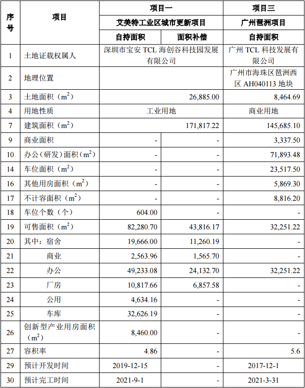 TCL产业园拥有的高价值地块不只这一处,房地产开发收入的另一块地在深圳。深圳市宝安TCL海创谷科技园发展有限公司艾美特项目,预计2019年底开发,2021年9月完工。